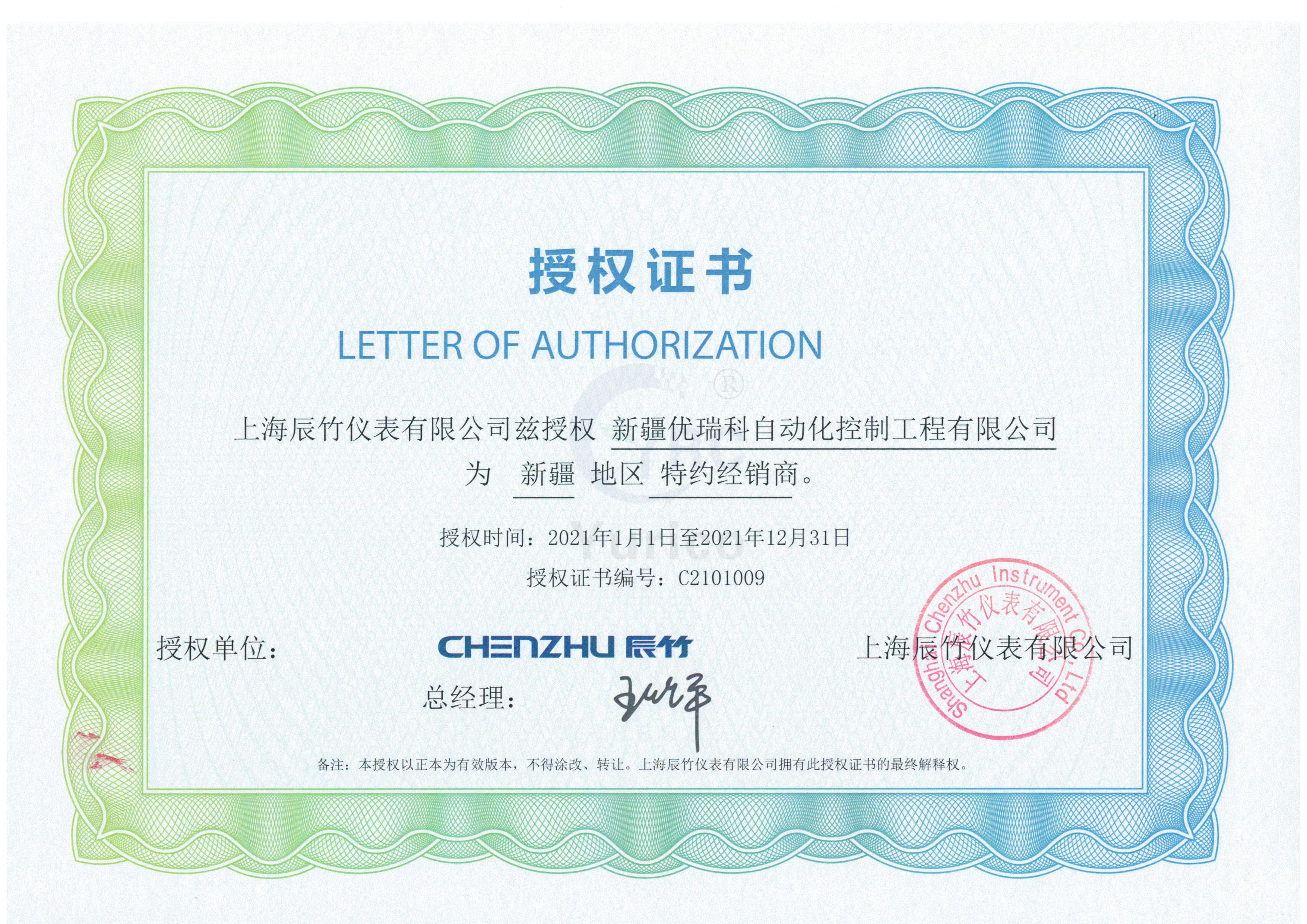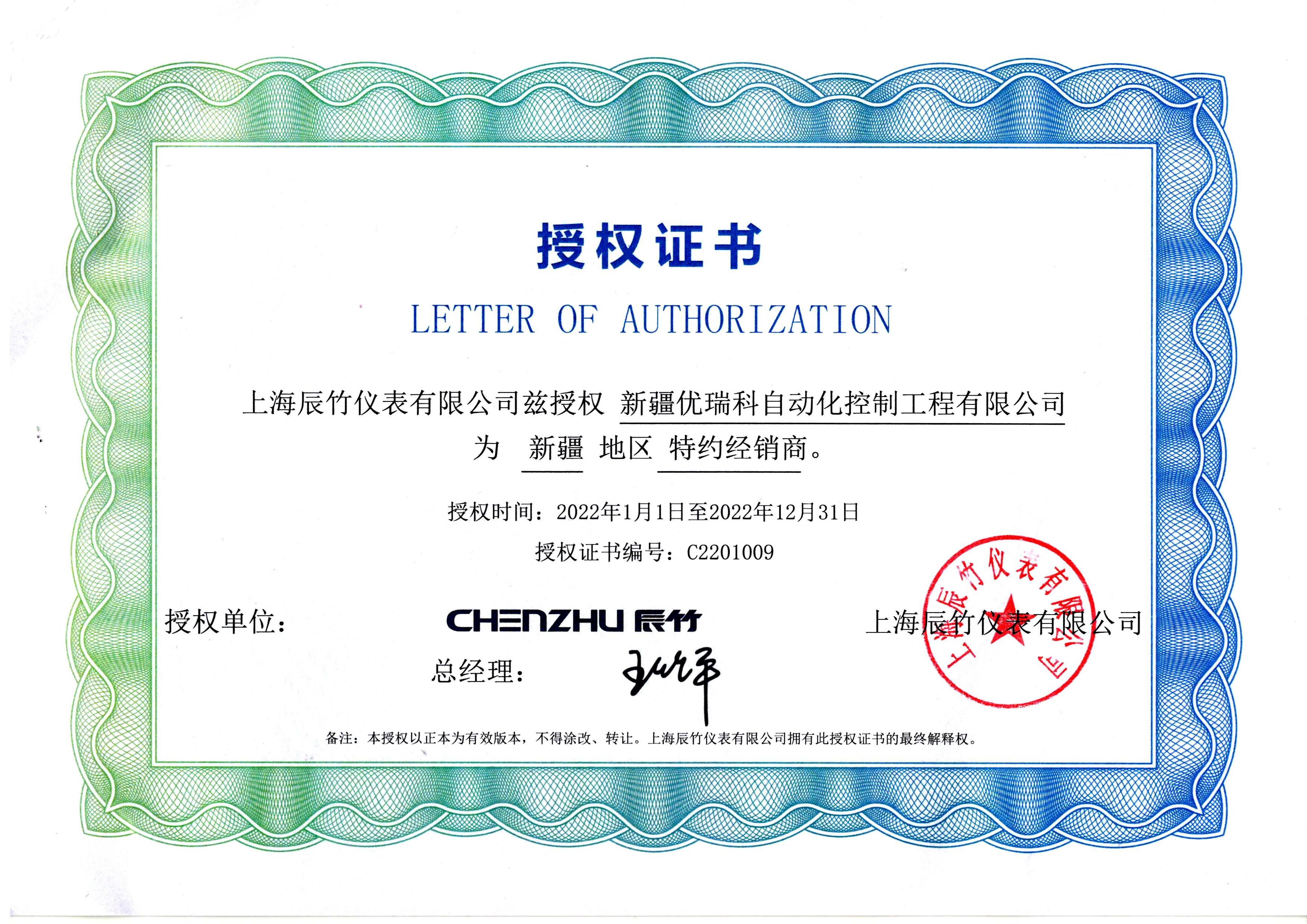 辰竹仪表授权证书